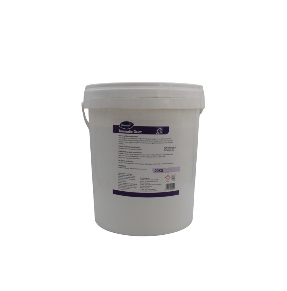 The Diversey Jonmatic Duet Bucket is an industrial-strength chlorinated sanitiser designed for comprehensive kitchen hygiene. With its 20KG bulk packaging, this product is perfectly suited for high-volume users such as hotels and restaurants in Tanzania and Zanzibar, where maintaining the highest standards of cleanliness is essential. The sanitiser’s unique dual halogen effect not only ensures thorough cleaning and disinfection of equipment, surfaces, and utensils but also helps in preventing the development of microbial resistance, safeguarding your food preparation areas with unparalleled efficiency.